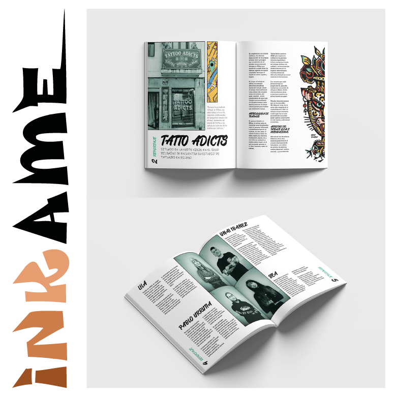 La realización de un reportaje fue un reto marcado este año académico, el cual formará parte de un proyecto de revista completa que se llevará a cabo más adelante. Al ser un tema libre, escogí el mundo del tatuaje en Bilbao y más específicamente para este apartado el estudio de Tattoo Adicts localizado en el barrio de Bilbao La Vieja. Además, he desarrollado el logotipo de la revista junto con la invención del nombre de este: Inkame. Este hace referencia tanto al acto como a la tinta (ink). El estilo elegido se basa en el mundo artístico del tatuaje, pero sobre todo en la corriente del old school o tradicional, tanto por los orígenes como por su influencia en el recorrido. No obstante para la apreciación de los diseños y contenido se usa un gran margen buscando espacios en blanco.