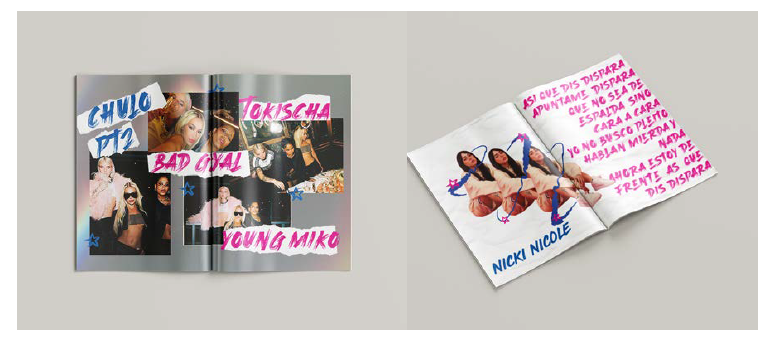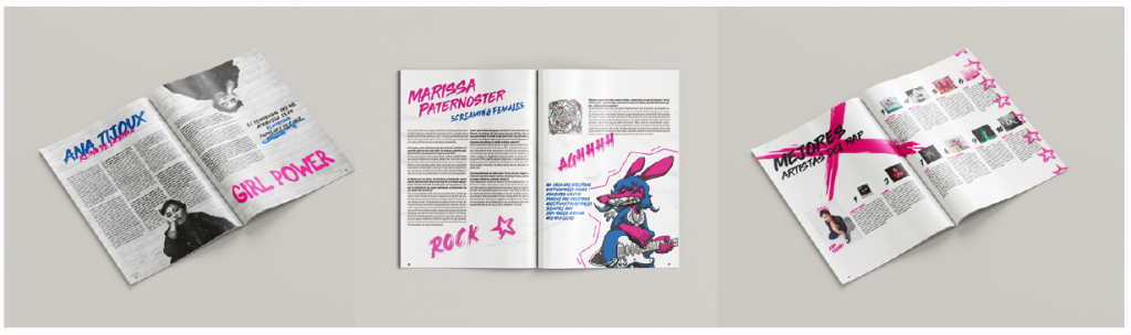 Estas hojas presentadas pertenecen a una revista donde se recogen cantantes mujeres divididas en estilos musicales donde se recoge tanto entrevistas como en top 10 del género. Buscábamos un estilo urbano con el uso de dos colores. Esos colores parten del uso de la sociedad en atribuirlos a un género y la necesidad de romper con ello. En estas fotos adjunto algunas de las páginas maquetadas por mi.