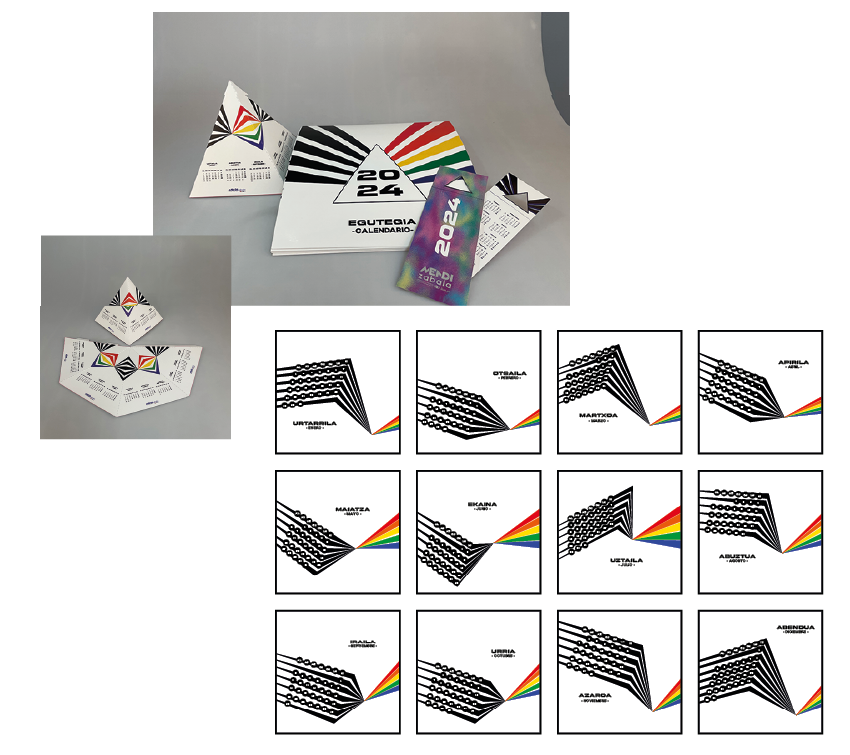 En el primer año del curso de diseño gráfico nos presentaron un proyecto grupal donde teníamos que crear tres tipos de calendarios para el instituto Mendizabala donde estudiamos basados en la palabra asignada. A nuestro grupo nos tocó la palabra luz. Partiendo de ello, desarrollamos estos tres calendarios a partir de la teoría de la luz y el prisma que consiste en como después de atravesarlo se reflejan los colores. Para desarrollar y reforzar un poco más este concepto utilizamos las horas de luz de cada mes para ilustrar mas o menos cantidad de colores y alturas donde se posiciona el cambio de negro a ellos. Además, utilizamos diferentes materiales que interactuasen con la luz. En la pirámide se utilizó un laminado satinado con destellos de purpurina y en el marcapáginas un holográfico. Con esto buscábamos darle al concepto una totalidad en todos sus aspectos. Por último cabe mencionar el hecho estético de estos calendarios, ya que es la principal premisa a la hora de diseñar ya que hoy en día a nivel funcional estos son usados de manera digital.
