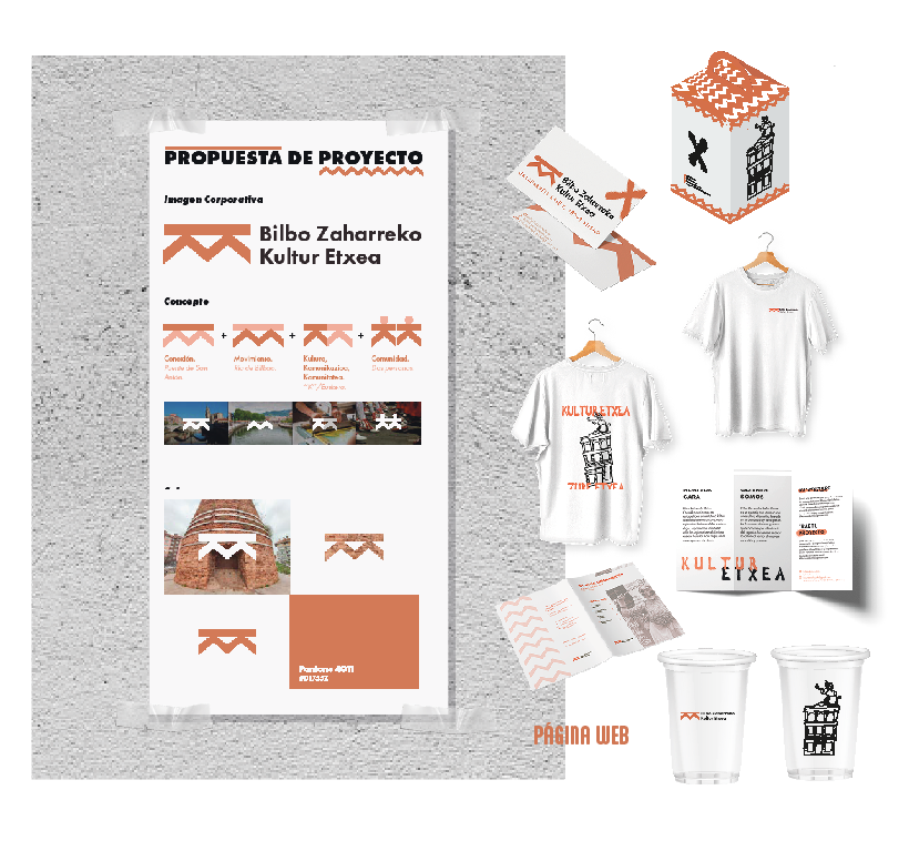 Este proyecto consistía en el rediseño de una asociación a la cual mi grupo y yo elegimos Bilbo Zaharreko Kultur Etxea. Todo se planteaba para encontrar nuevos participantes y financiación y para ello llamar la atención y crear confianza. Nos basamos en cuatro conceptos clave que representan al espacio: conexión, movimiento, cultura, comunidad y comunicación. Todo simbolizado a partir de la K de kultur, ya que el trabajo principal que realizan es al rededor de la cultura. Con ello también se simboliza elementos clave del barrio como el puente San Antón y la chimenea minera (usándolo como color corporativo). No hay mejor manera de darse a conocer y conseguir financiación que mediante productos de contacto y merchandasing como los creados (vasos, camisetas, tarjetas de visita, boletín informativo, página web y folleto).