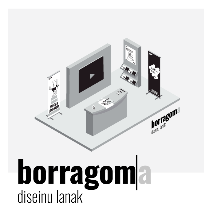 Para el segundo año del grado, hemos tenido que crear nuestro propio estudio de diseño gráfico junto con un stand donde se presenta la empresa y sus productos. Partimos de la premisa de mugak ezabatzen (borrando límites) para reflejar la esencia de la empresa: crear y mejorar la imagen de las empresas sin límites y sin miedo a borrar los errores para poder mejorarlos. Esto se refleja tanto en el nombre (Borragoma, goma de borrar) como en la construcción del logotipo ya que este simula la escritura en digital con su posibilidad de borrarlo. Además, pusimos la última letra con matiz para simular el predeterminado, queriendo reflejar como nos adelantamos a las diferentes situaciones. Dentro de los productos encontramos: pegatinas, roll-ups, folleto informativo, video de presentación, cartel, catalogo, tote bag, lápiz, cuaderno y tarjeta de visita. Cabe destacar la tarjeta de visita ya que lo desarrollamos como funda de una goma simulando que es el elemento gráfico creado (llamado Gom). Gom se usa en los diferentes productos como recurso debido a la facilidad que ofrece para identificarnos.